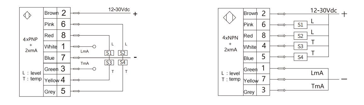 | B | 2 salidas de interruptor de nivel de líquido + 2 salidas de interruptor de temperatura + 1 salida analógica de nivel de líquido 4-20 mA + 1 salida analógica de temperatura 4-20 mA | |||||||||||||||||||||||||||||||||||